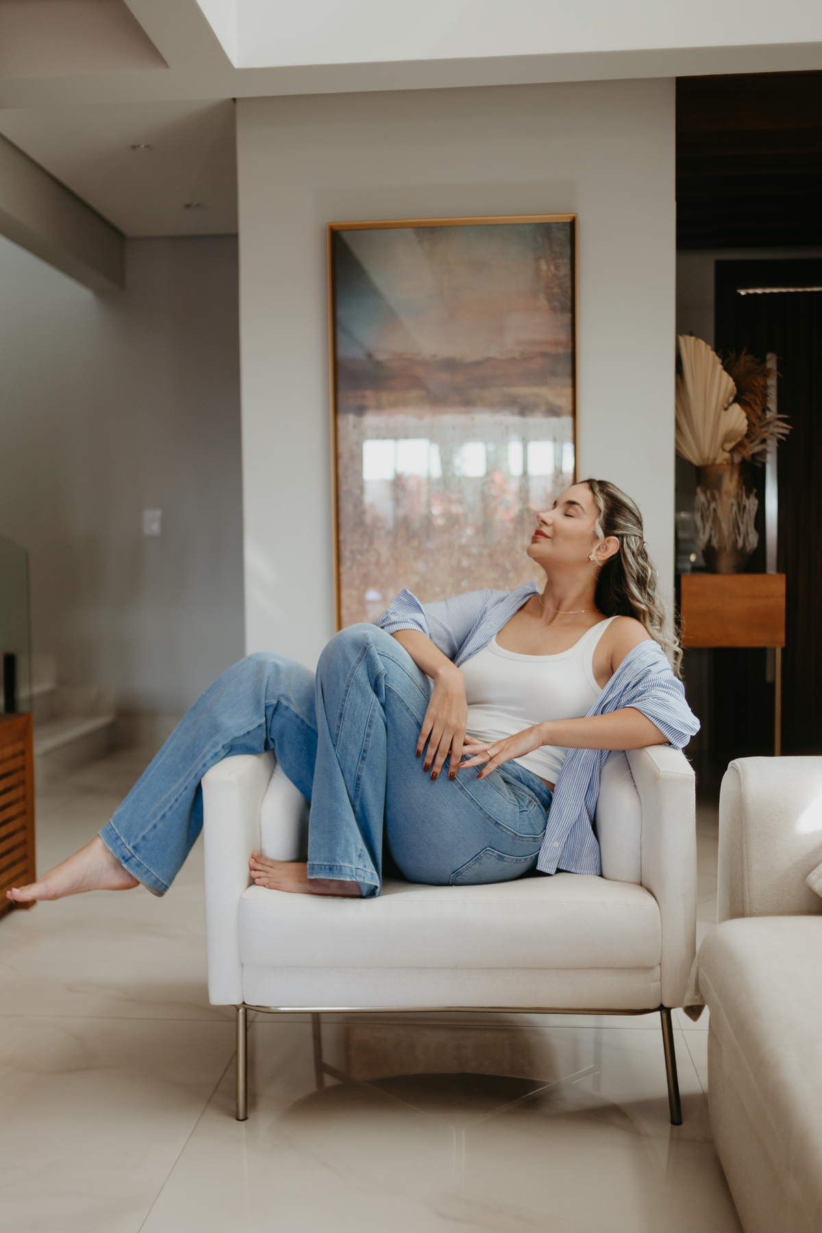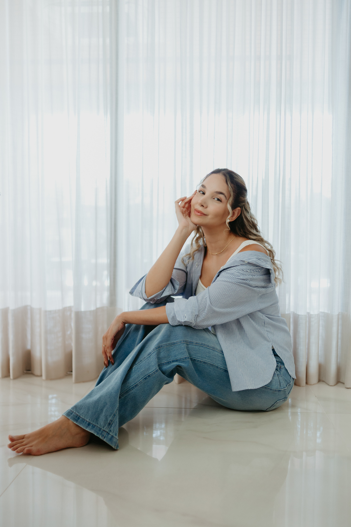Fizemos o ensaio na casa do noivo, um lugar cheio de aconchego, onde Isabella se sentia à vontade e confortável. A ideia era capturar o lado mais verdadeiro e genuíno dela, sem pressa, sem forçar poses. O resultado? Fotos que transmitem exatamente isso: simplicidade, empatia e a sensação de um ambiente seguro e acolhedor.